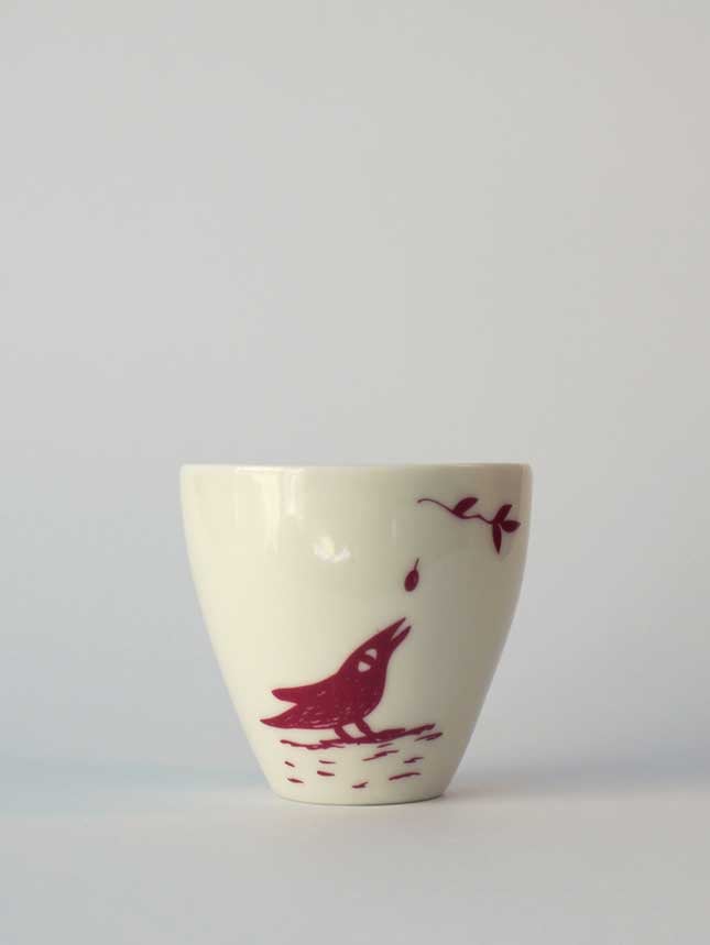 Tasse en porcelaine faite à la main et décorée d'un oiseau sur les parois extérieurs et une baie sauvage à l'intérieur.